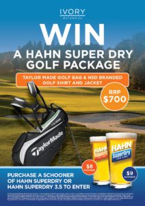 Purchase any schooner of Hahn SuperDry or Hahn SuperDry 3.5 for your chance to win a premium TaylorMade Golf Bag, plus a Hahn Super Dry branded golf shirt and jacket — total value $700 RRP.